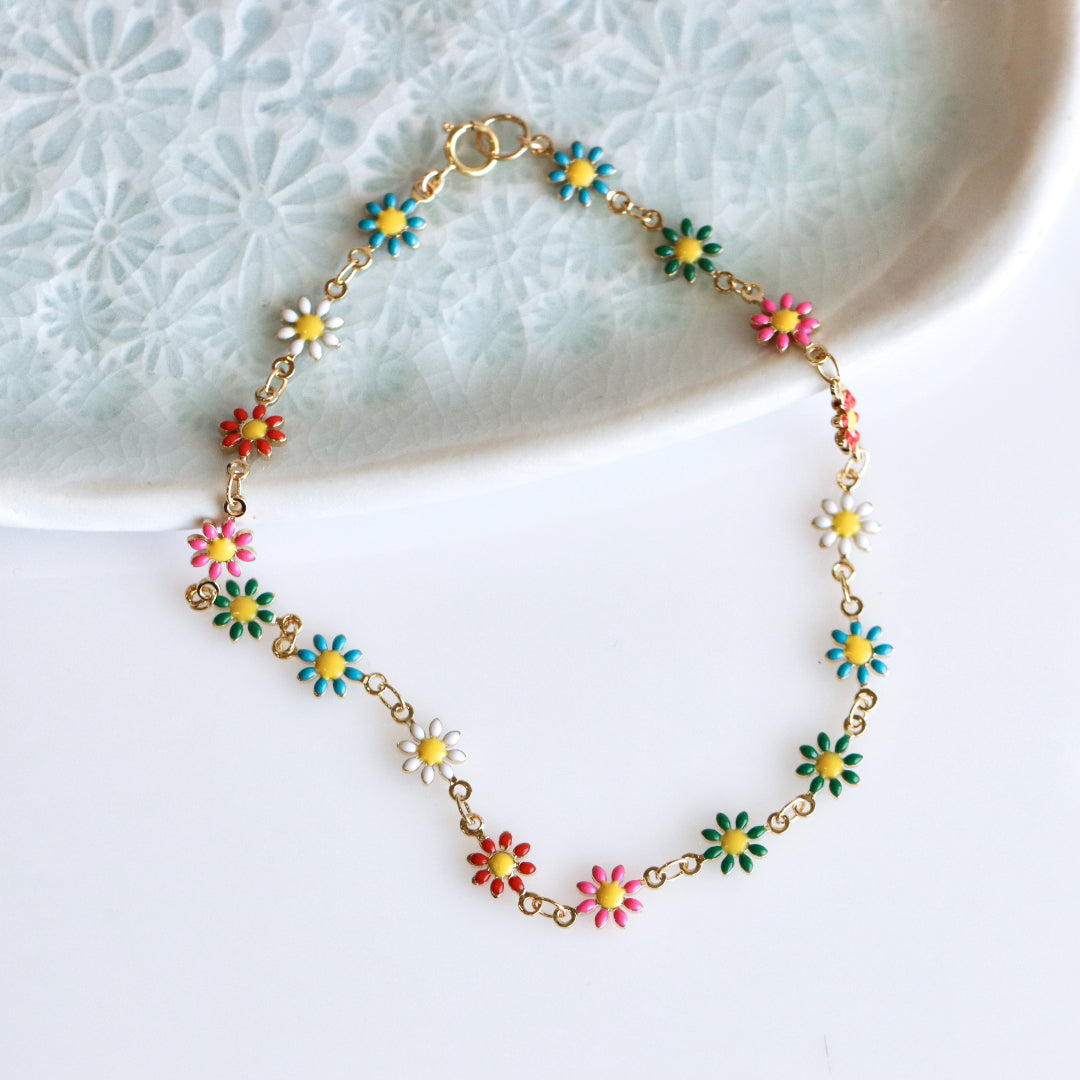The Bellis anklet features eye-catching daisy links with colorful enamel coloring. This stylish anklet adds a pop of color to any outfit! Wear the Bellis anklet solo or layered is the perfect way to show off your fashion-forward style.