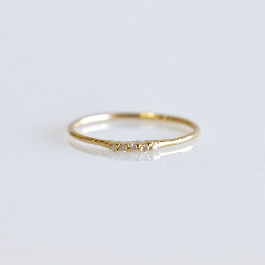 This Bar Diamond Ring features a pave setting with melee diamonds on a thin yellow gold band. The elegant design is perfect for stacking with other rings or for wearing alone.