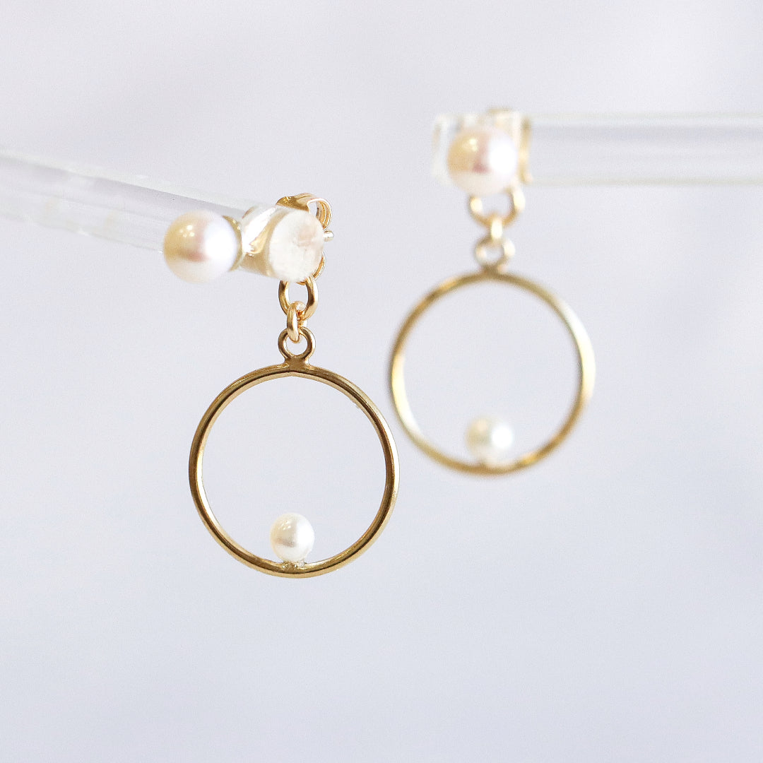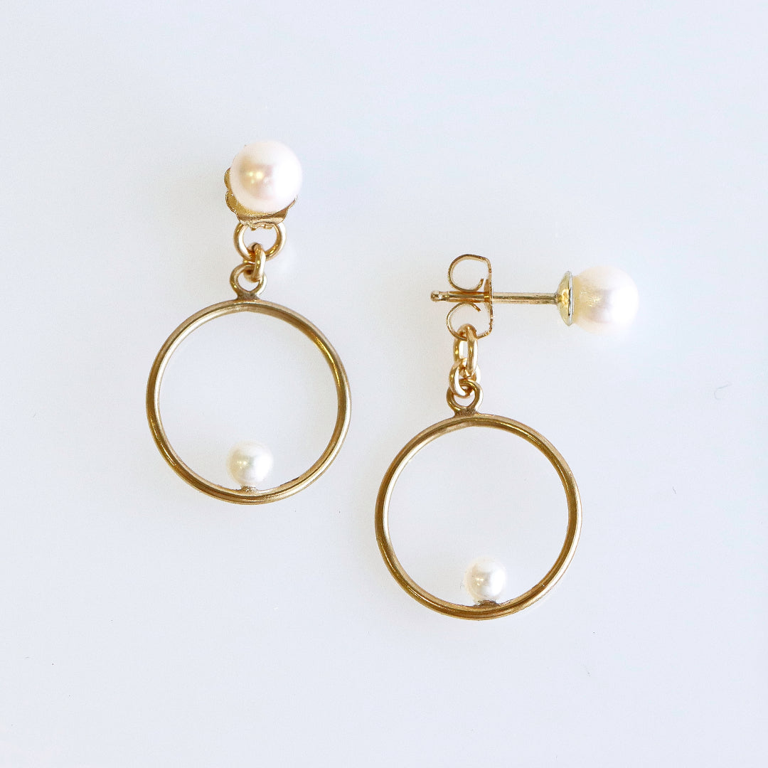 Vi Ling front to back style earrings of cream colored pearls paired with a round charm backing accents with matching pearls. The large size for a statement piece and a bold look.