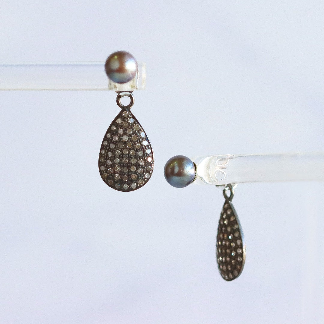 This unique earring, featuring a dark gray cultured pearl stud and a diamond drop pendant on the back side, showcases the Vi Ling signature front-to-back style. The oxidized silver and rough champagne diamonds add an edgy touch to the overall elegant look.