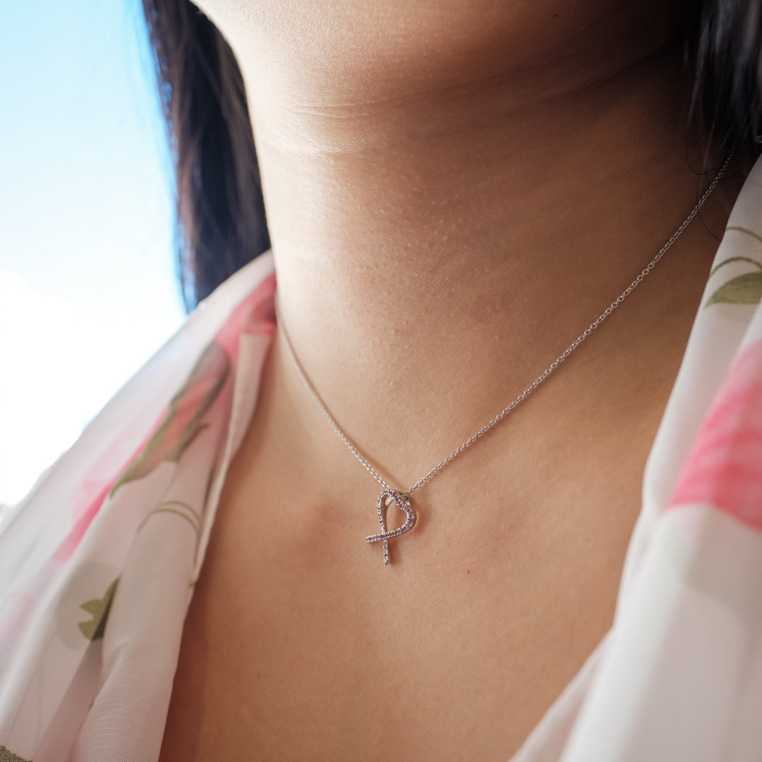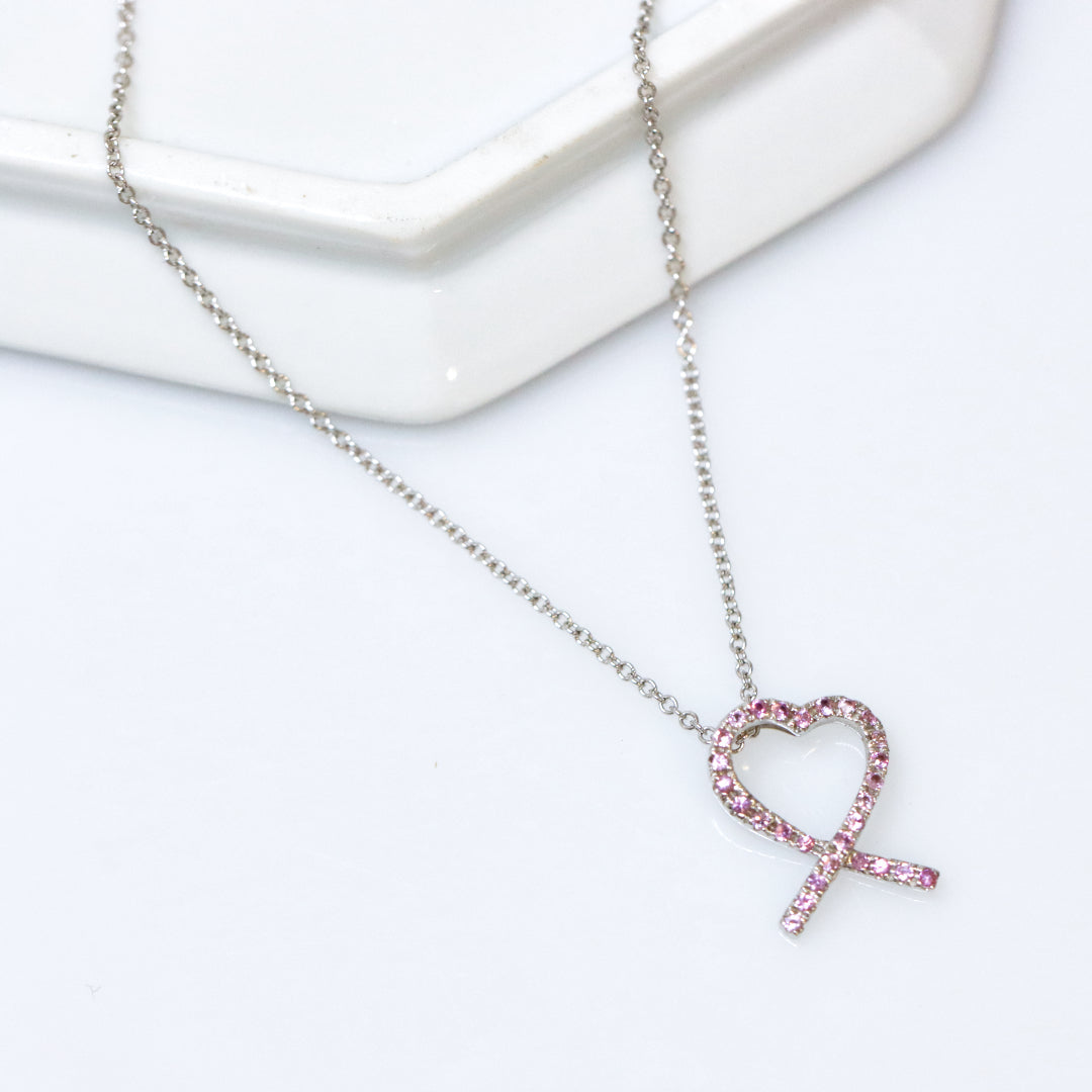 This 14k white gold chain holds a pendant featuring an open heart design adorned with pink sapphire stones set in prongs.