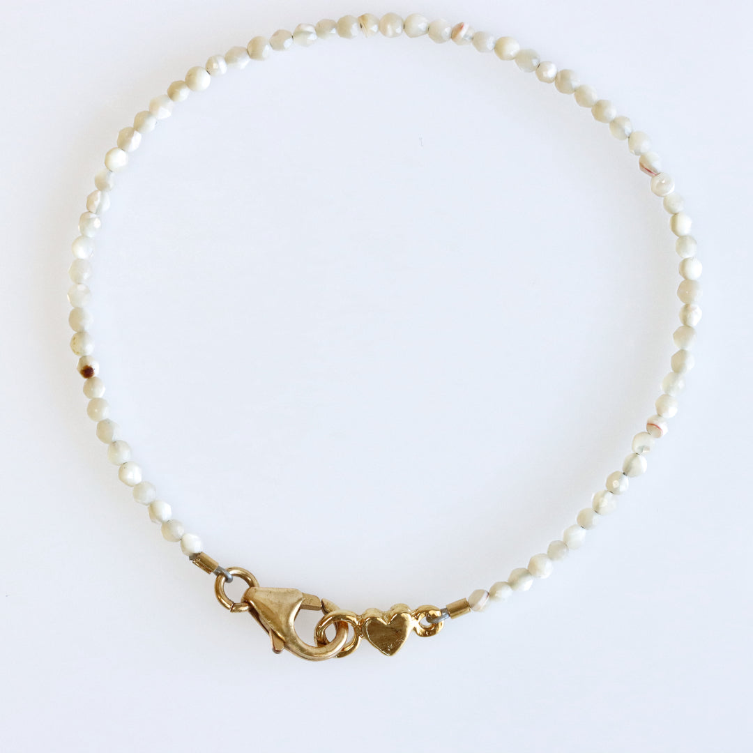 Tiny faceted shell pearl beads paired with heart toggle closure for a sweet and dainty stacking bracelet.