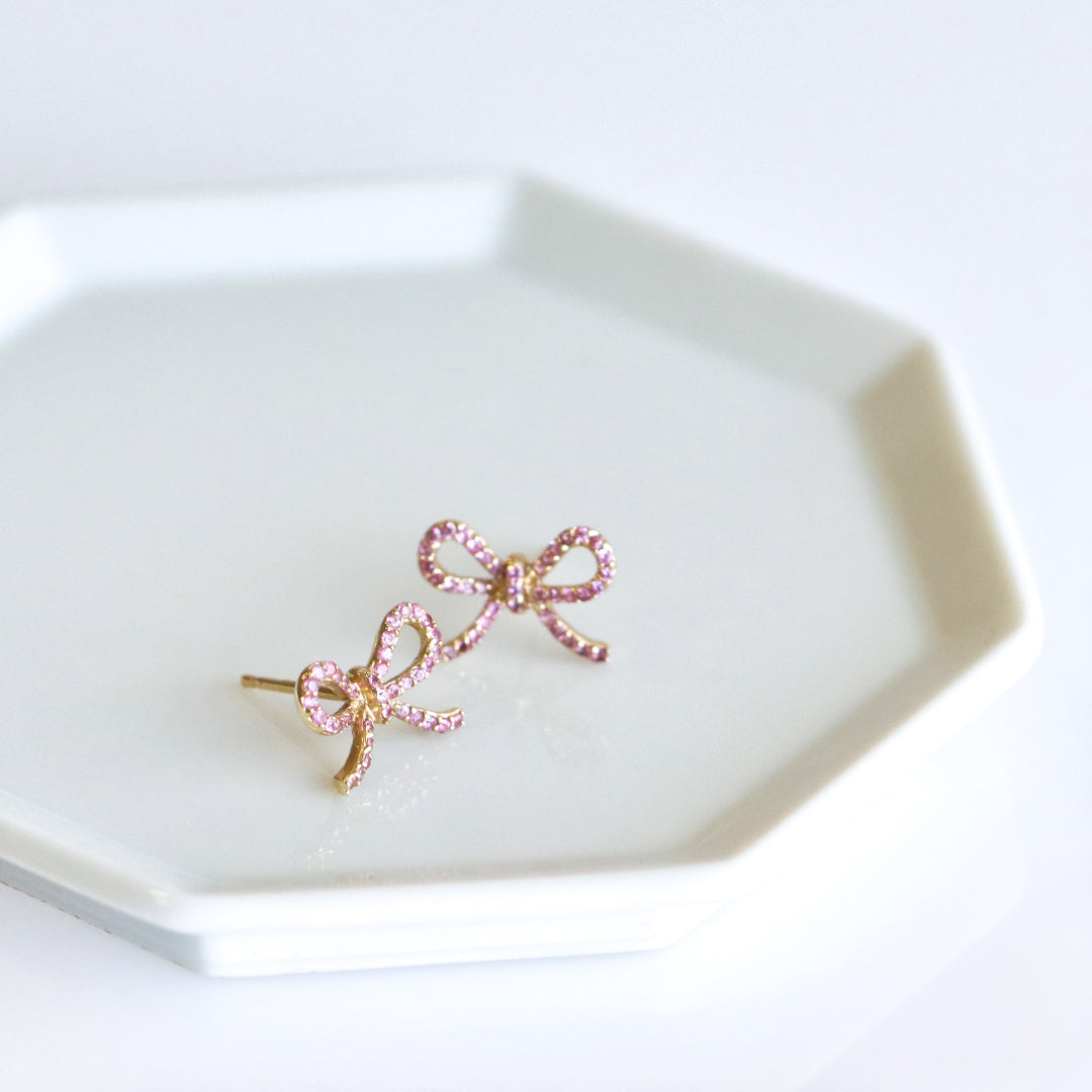 Crafted in 14k yellow gold, these bow stud earrings feature sparkling pave set pink Sapphires, making them a beautiful addition to any jewelry collection.