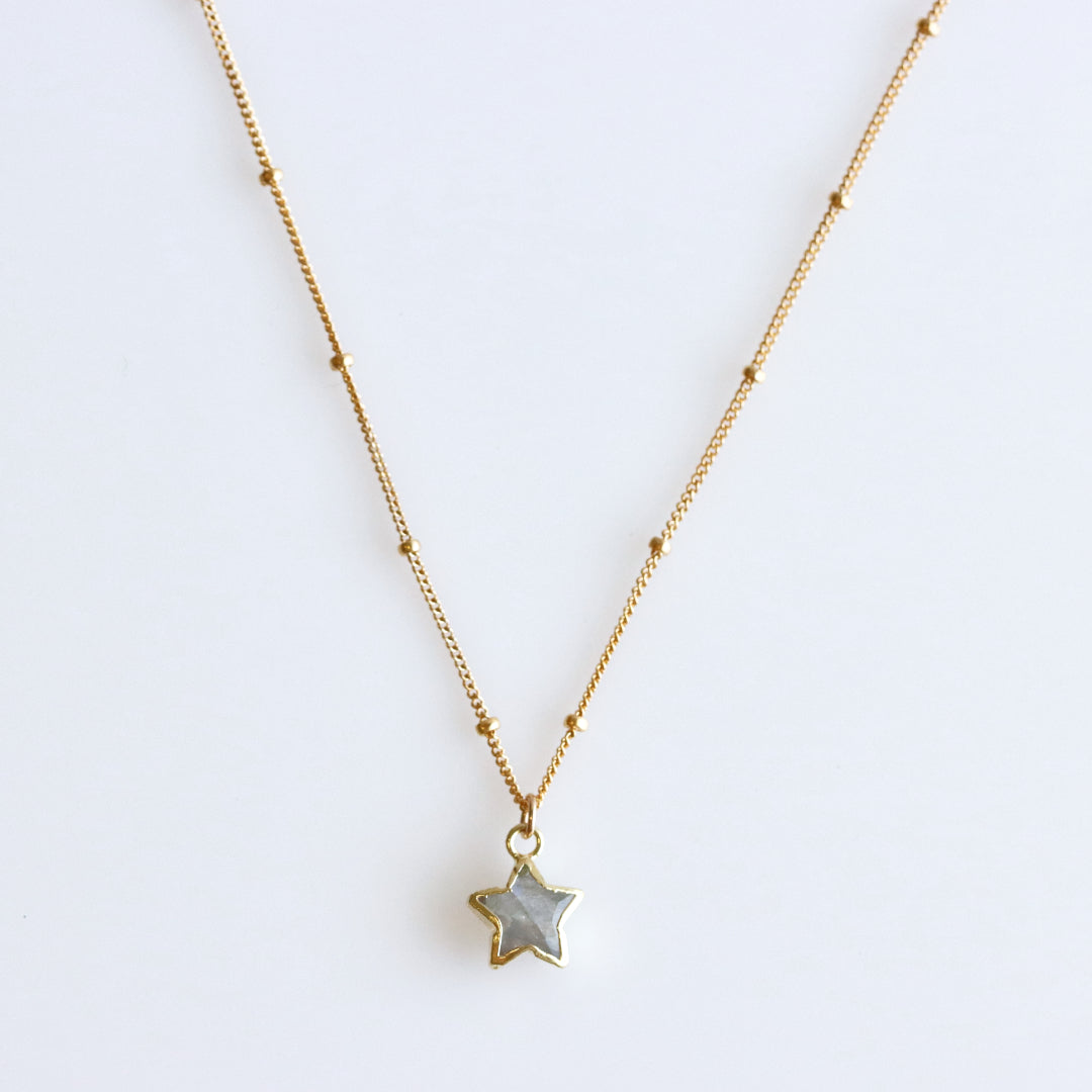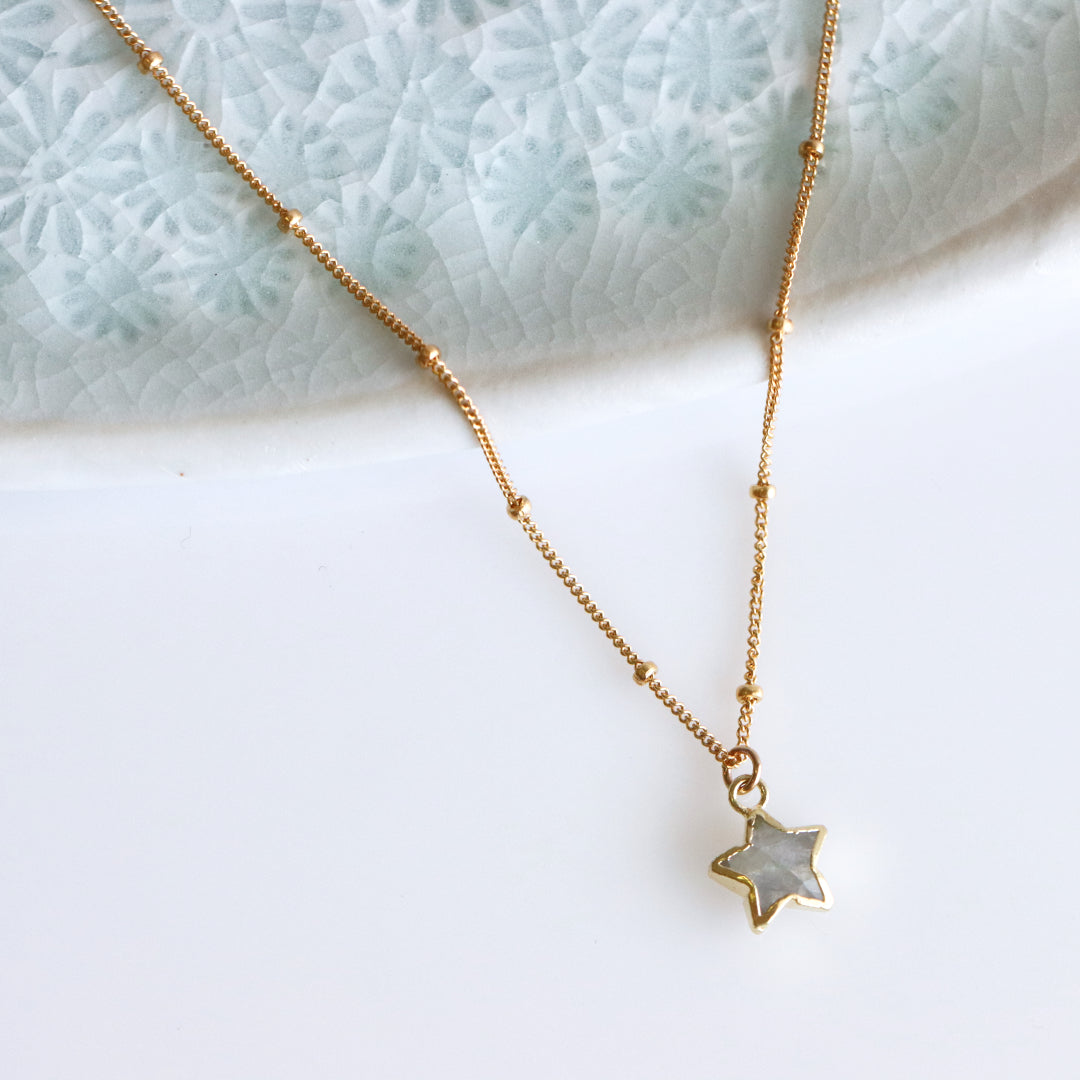 A faceted star cut Moonstone gemstone is nestled within a gold tone frame, adding a touch of illuminating sparkle. This elegant pendant paired with nugget cable chain is perfect for everyday wear.