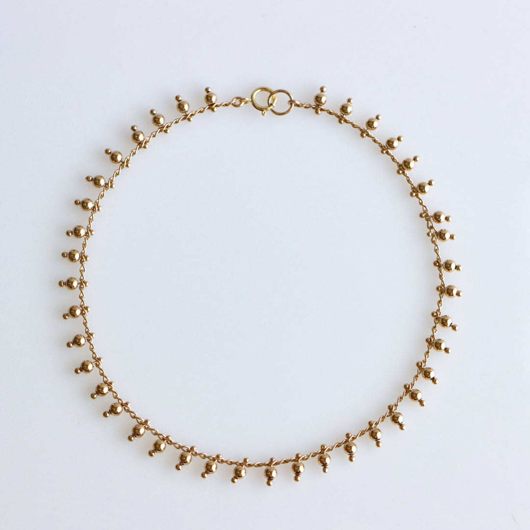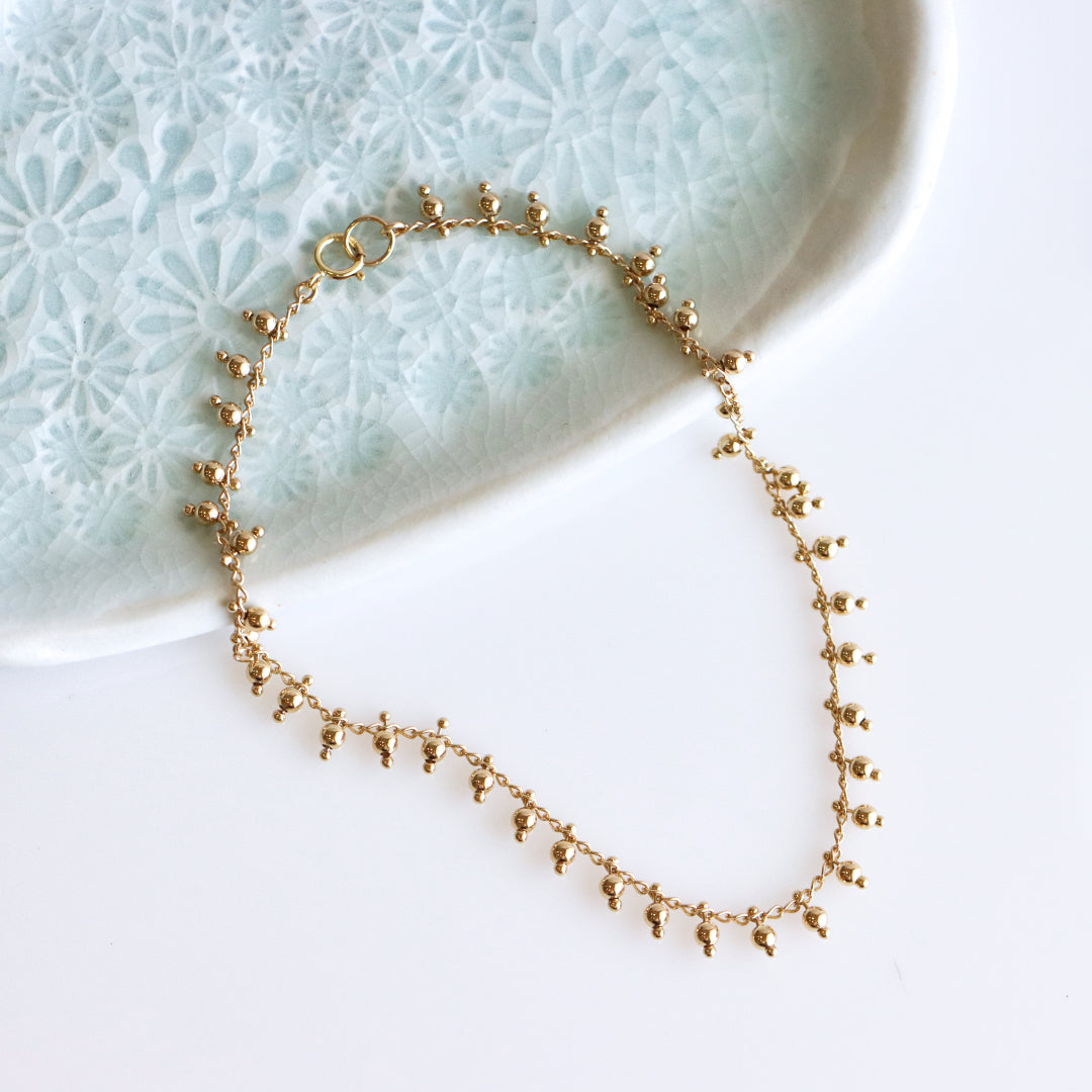 Take your style to the next level with the Stilla anklet. It features a cascading line of ball beads, set on a fancy chain, crafted in gold tone. An elegant design to pair with all your spring and summer styles.