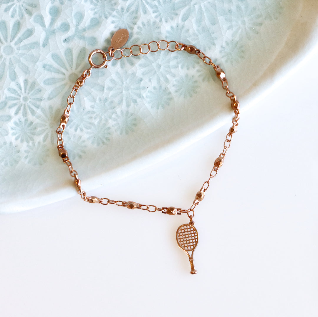 This Tennis racket charm paired with our popular Elise chain bracelet. The perfect accessory for the tennis enthusiast. Show off your style and love for the game with this dainty and elegant bracelet.